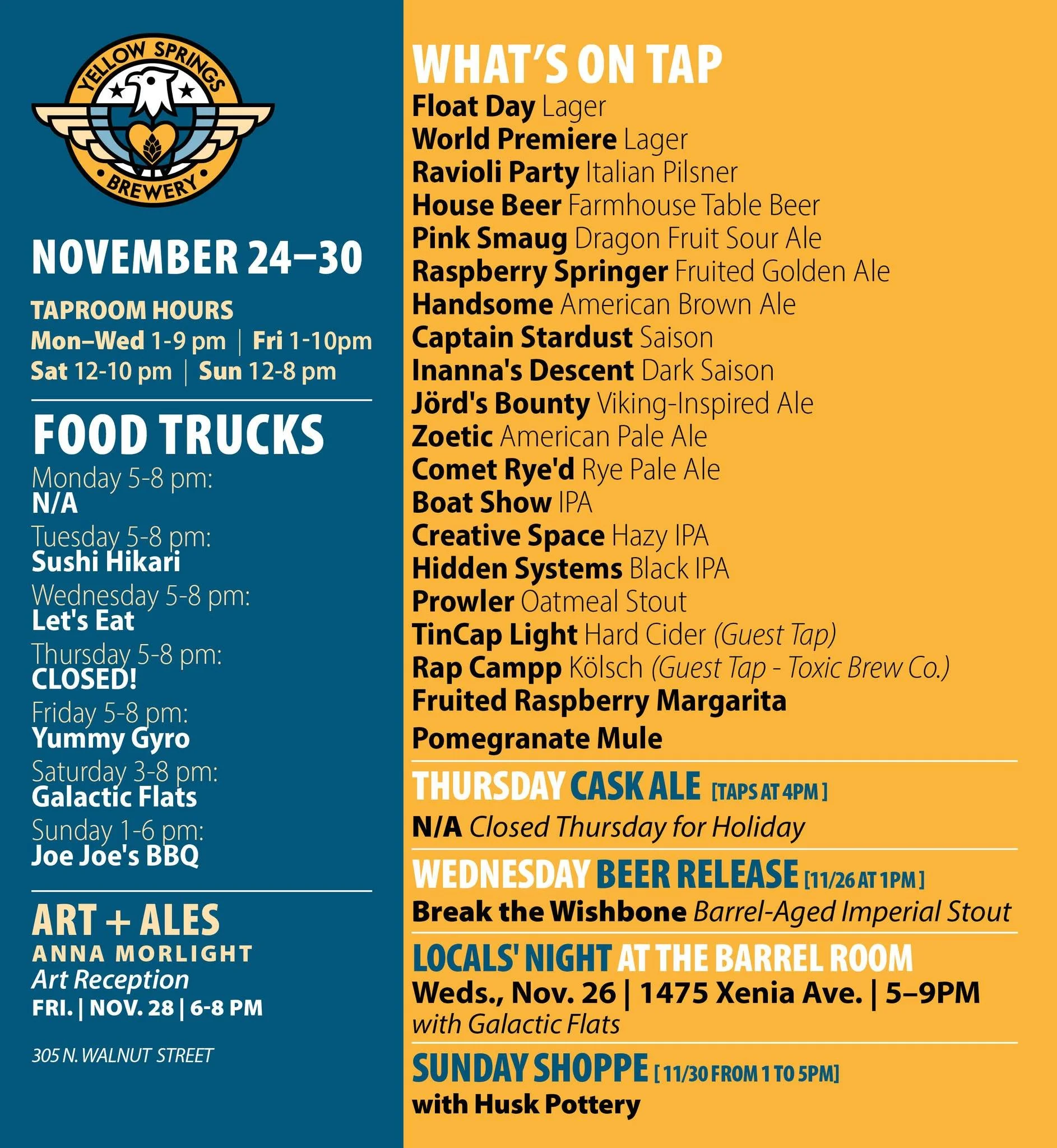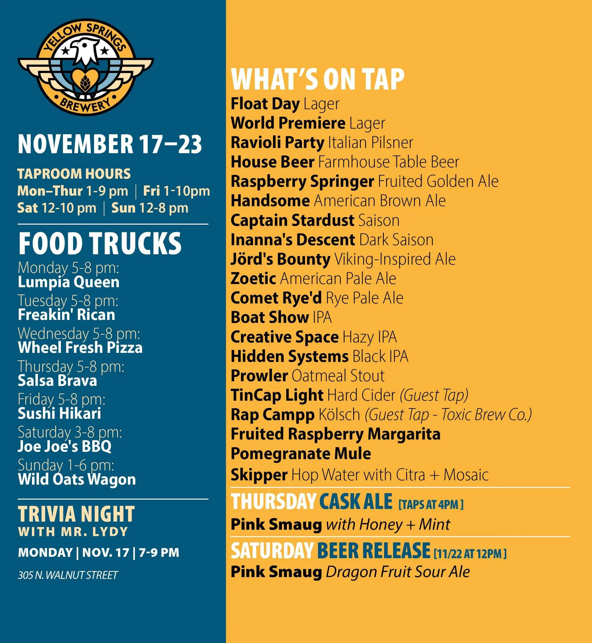 At Yellow Springs Brewery, we brew exceptional beer every day in every batch. Founded in 2013, today we produce multiple year-round and packaged brands, along with dozens of innovative seasonal beers. They can be found in restaurants and pubs in the Dayton and Columbus areas and in our tap rooms in Yellow Springs and Columbus.