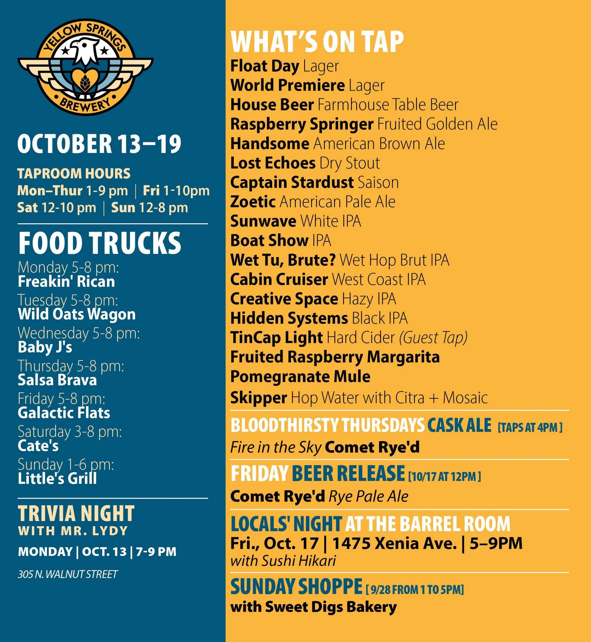 Our hometown taproom is a spacious, community-centered spot in the heart of Yellow Springs, and is connected to our production brewery. Intimate and tv-free, our Taproom hosts our old-school and experimental brews, local food trucks, and all kinds of local fun. We’re also located adjacent to the Little Miami Scenic Trail, our much-beloved bike path used by local cyclists, joggers, and outdoor enthusiasts.