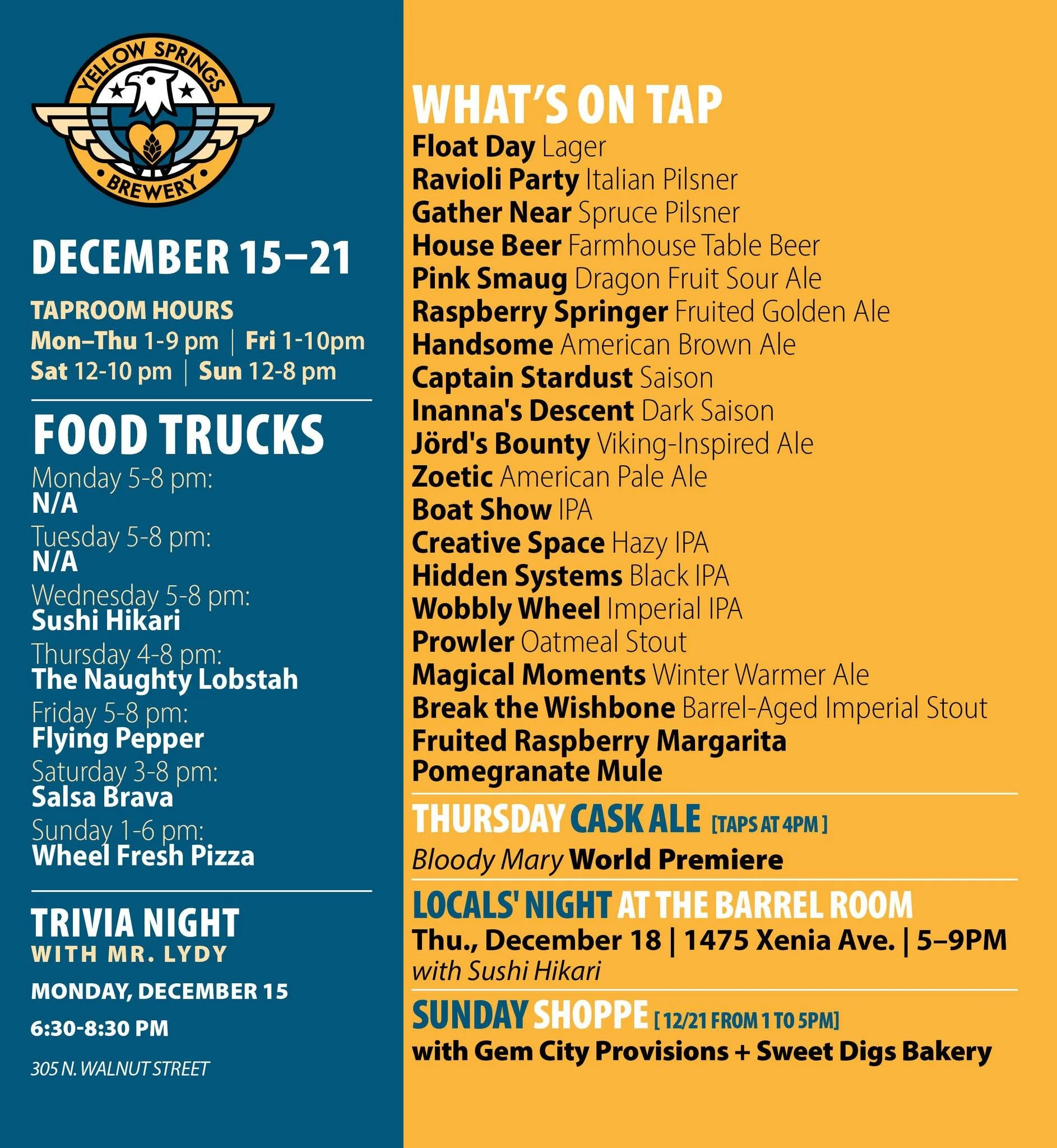 At Yellow Springs Brewery, we brew exceptional beer every day in every batch. Founded in 2013, today we produce multiple year-round and packaged brands, along with dozens of innovative seasonal beers. They can be found in restaurants and pubs in the Dayton and Columbus areas and in our tap rooms in Yellow Springs and Columbus.